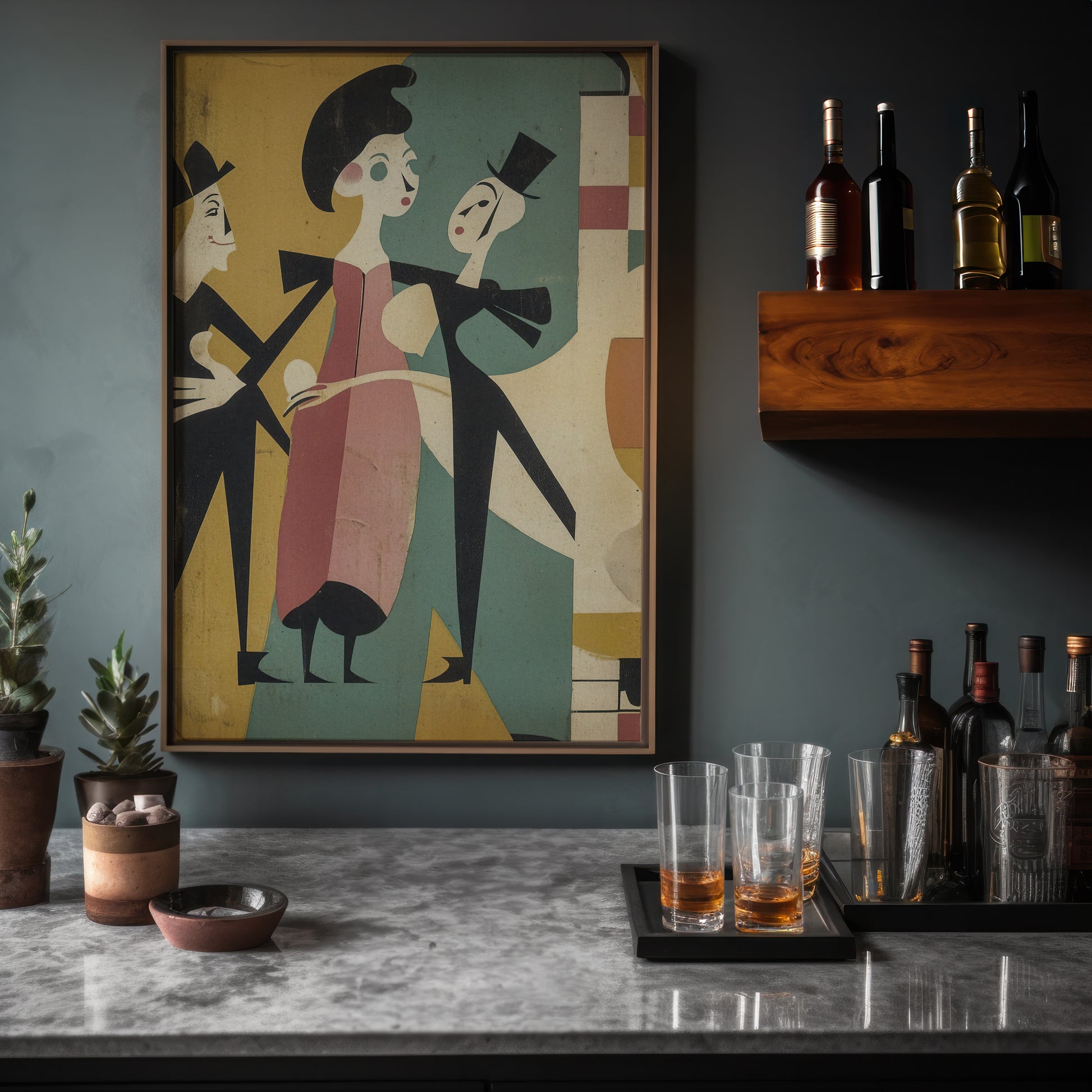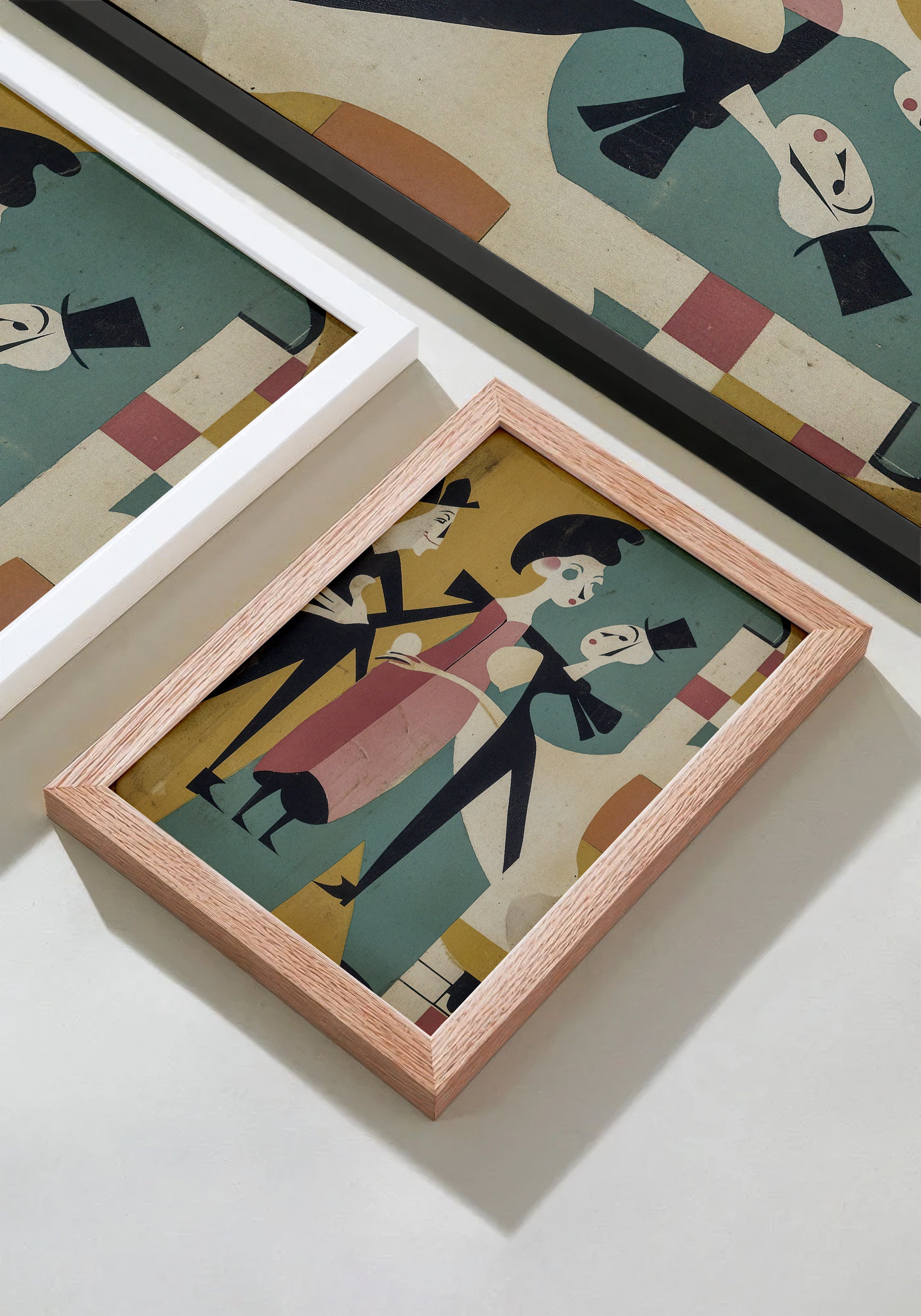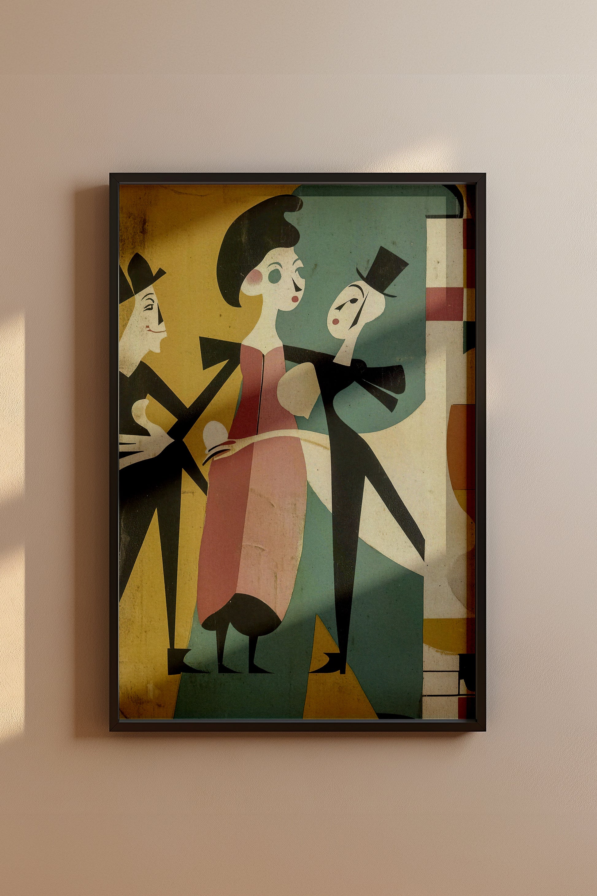 This dynamic 1920s-inspired print brings the liveliness of dance and movement to life, featuring whimsical characters, bold color blocks, and playful lines. A stunning celebration of Art Deco creativity, it infuses energy and sophistication into any space.