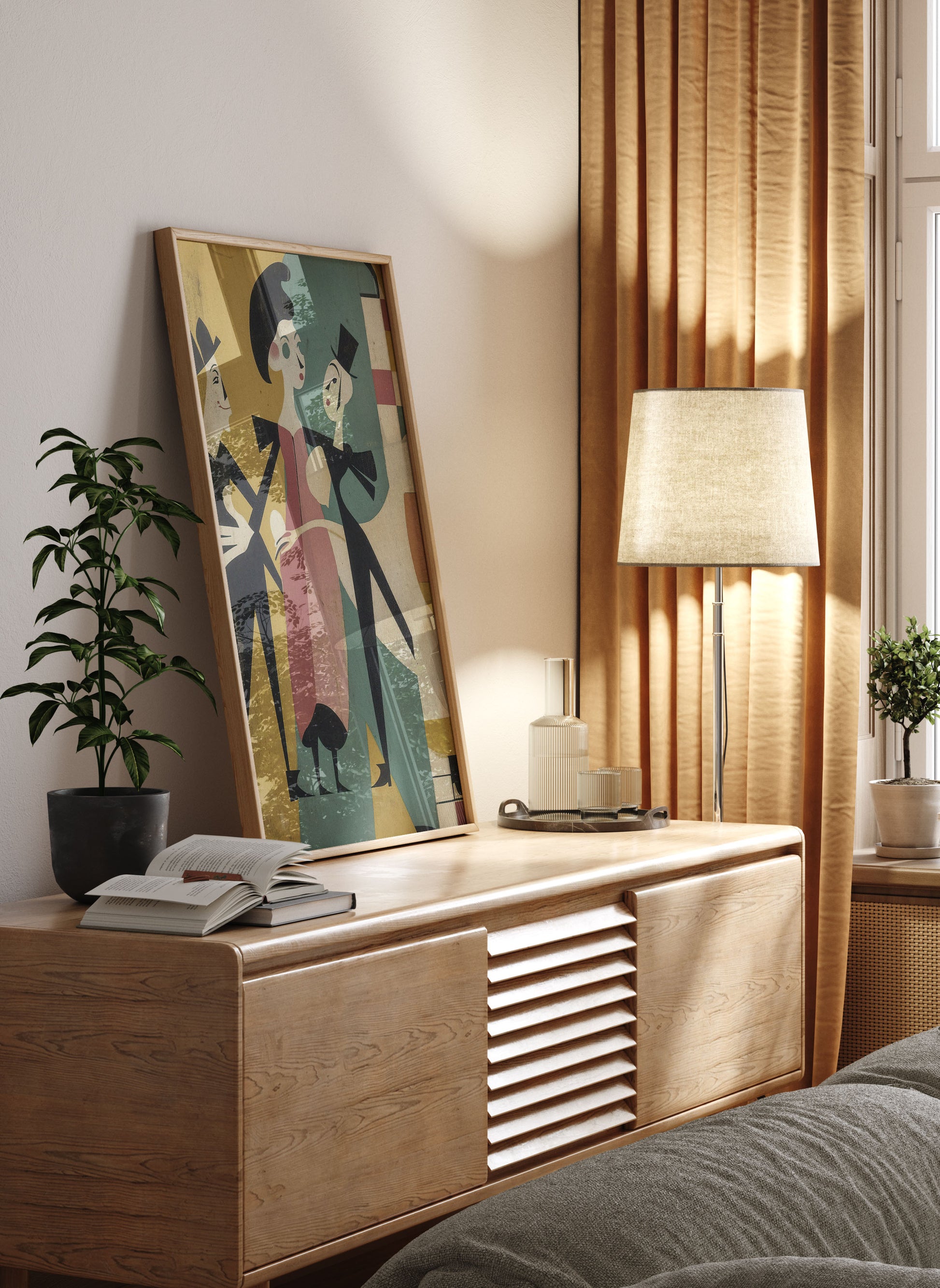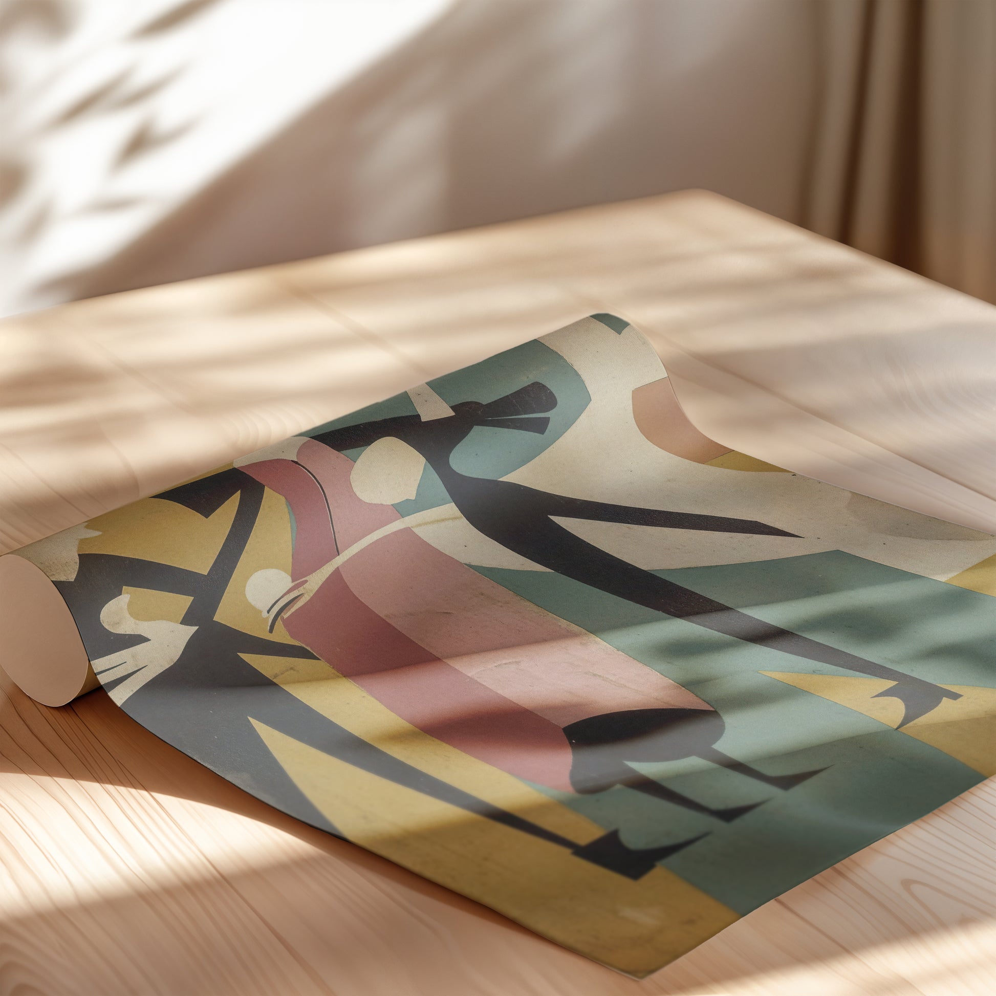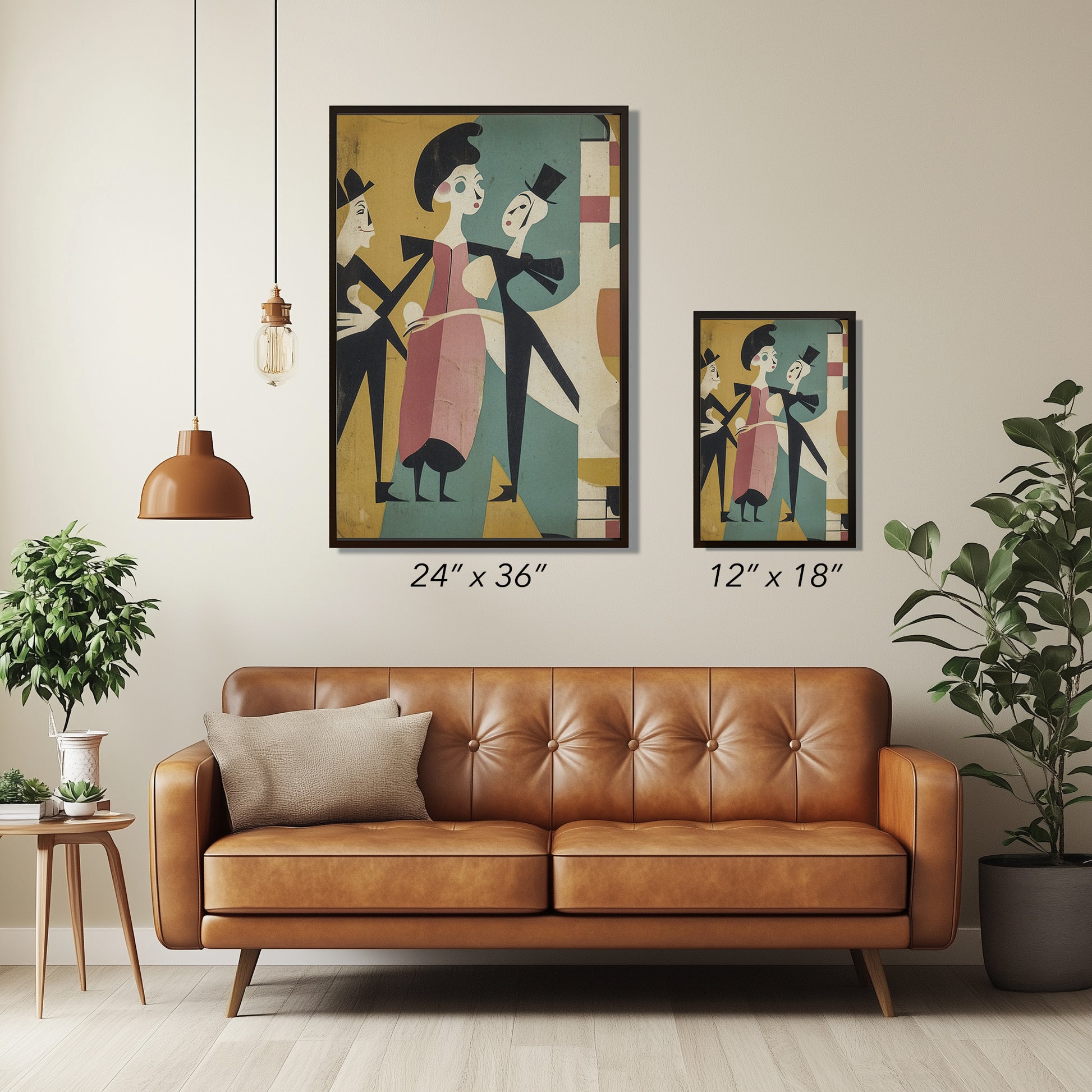This dynamic 1920s-inspired print brings the liveliness of dance and movement to life, featuring whimsical characters, bold color blocks, and playful lines. A stunning celebration of Art Deco creativity, it infuses energy and sophistication into any space.