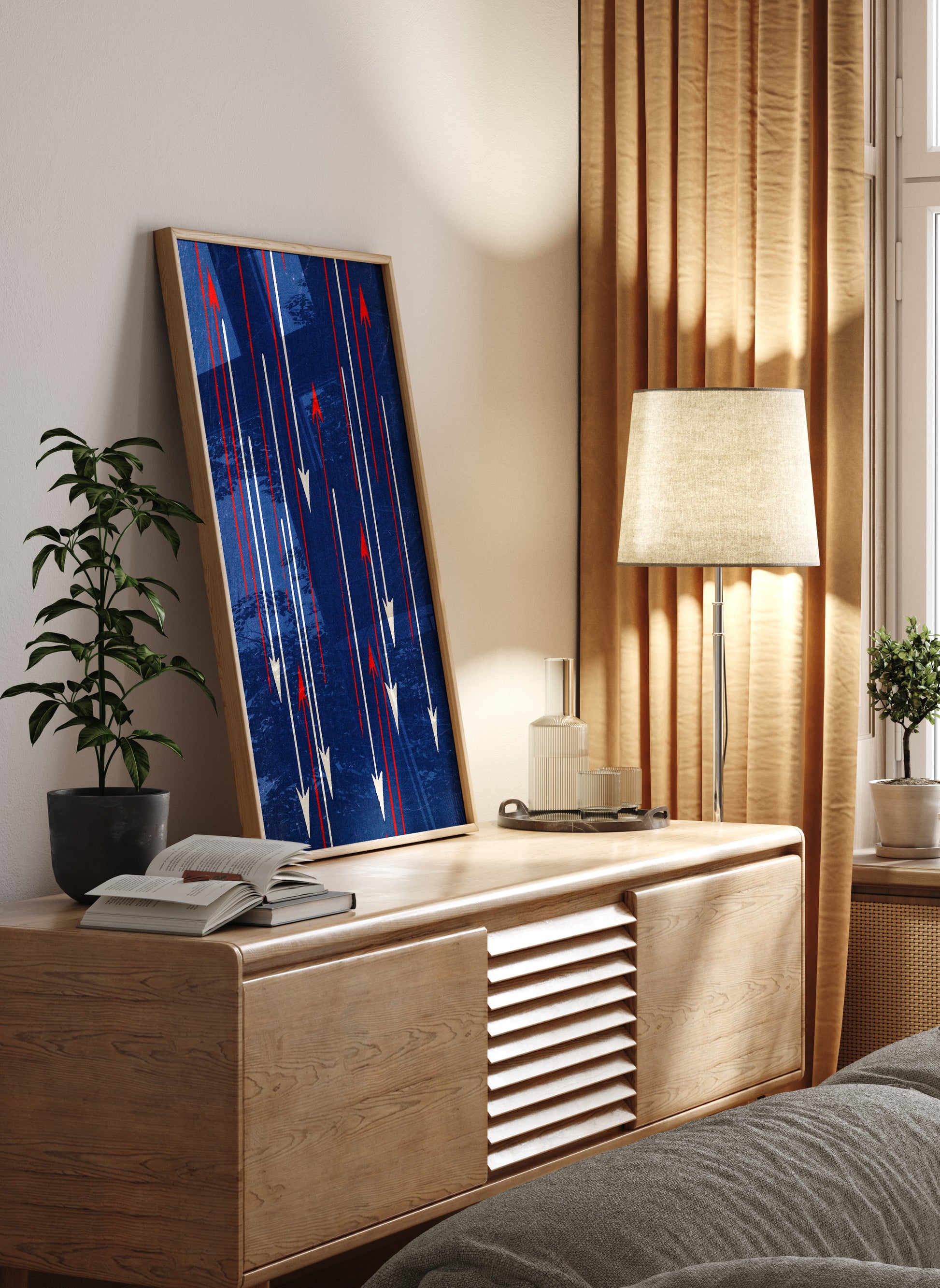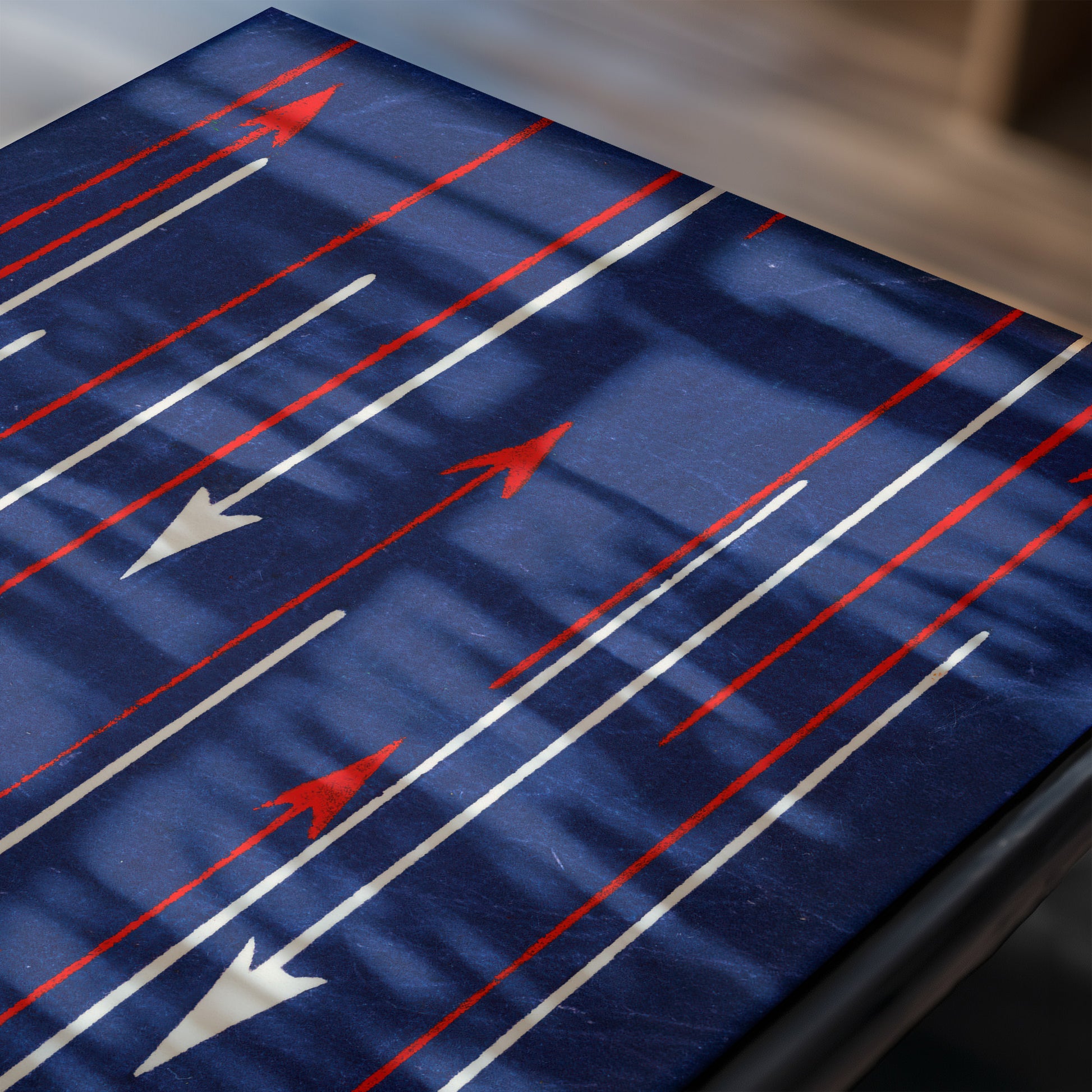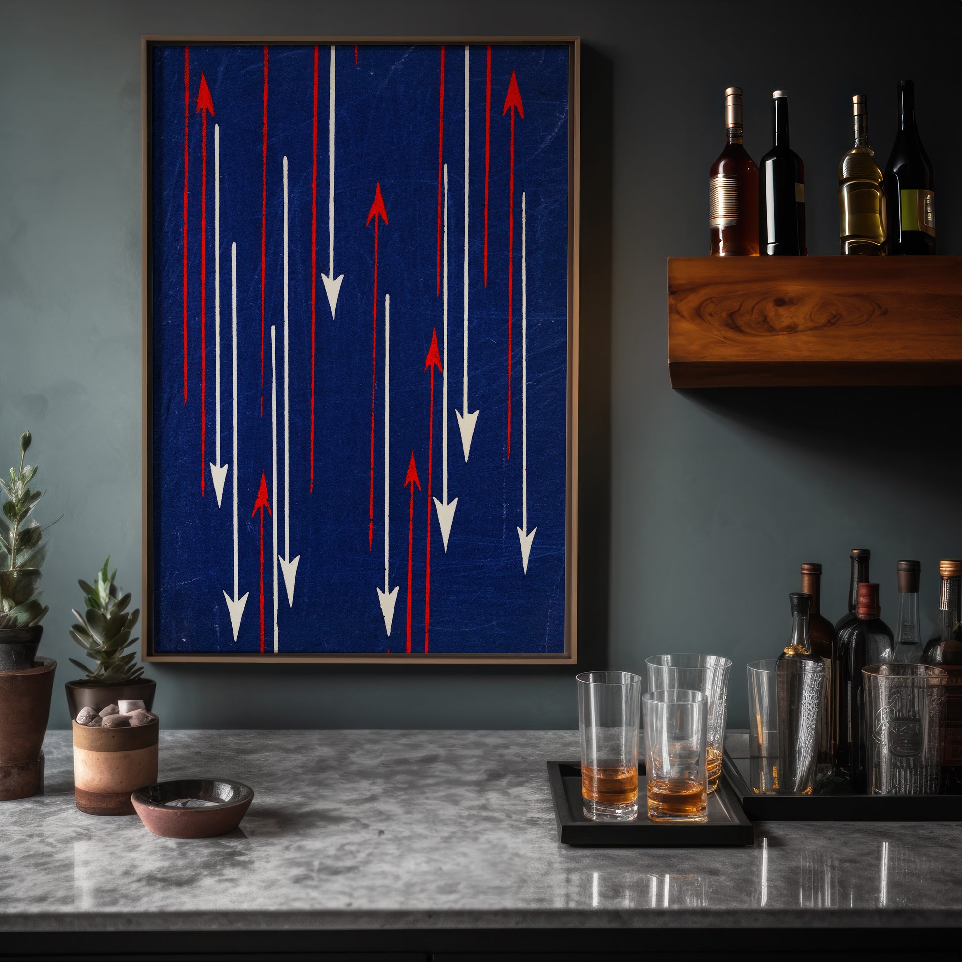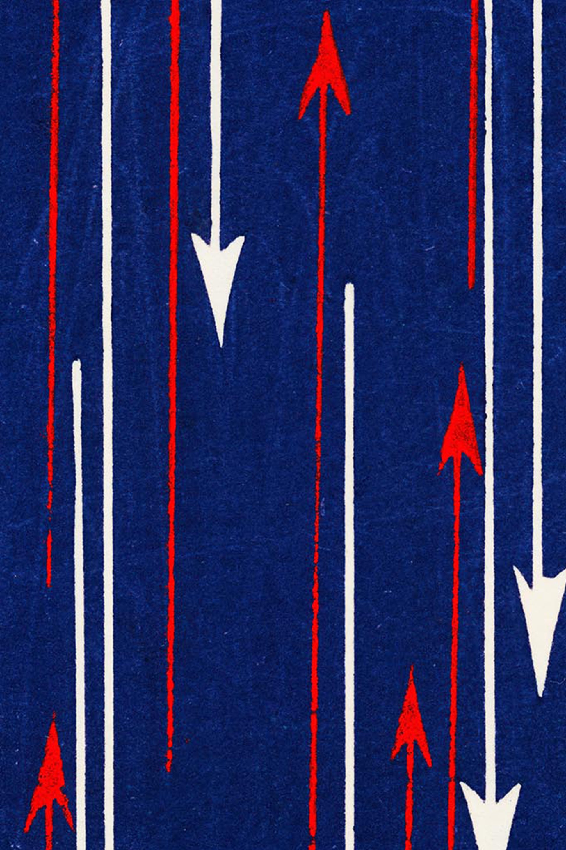 Here, vertical arrows cascade in opposing directions across a saturated indigo ground. Red arrows ascend with sharp intensity, while ivory arrows descend in measured contrast. The repetition feels deliberate yet dynamic, creating a push-and-pull rhythm that energizes the composition. What appears minimal at first glance reveals a sophisticated understanding of spacing, balance, and visual cadence.