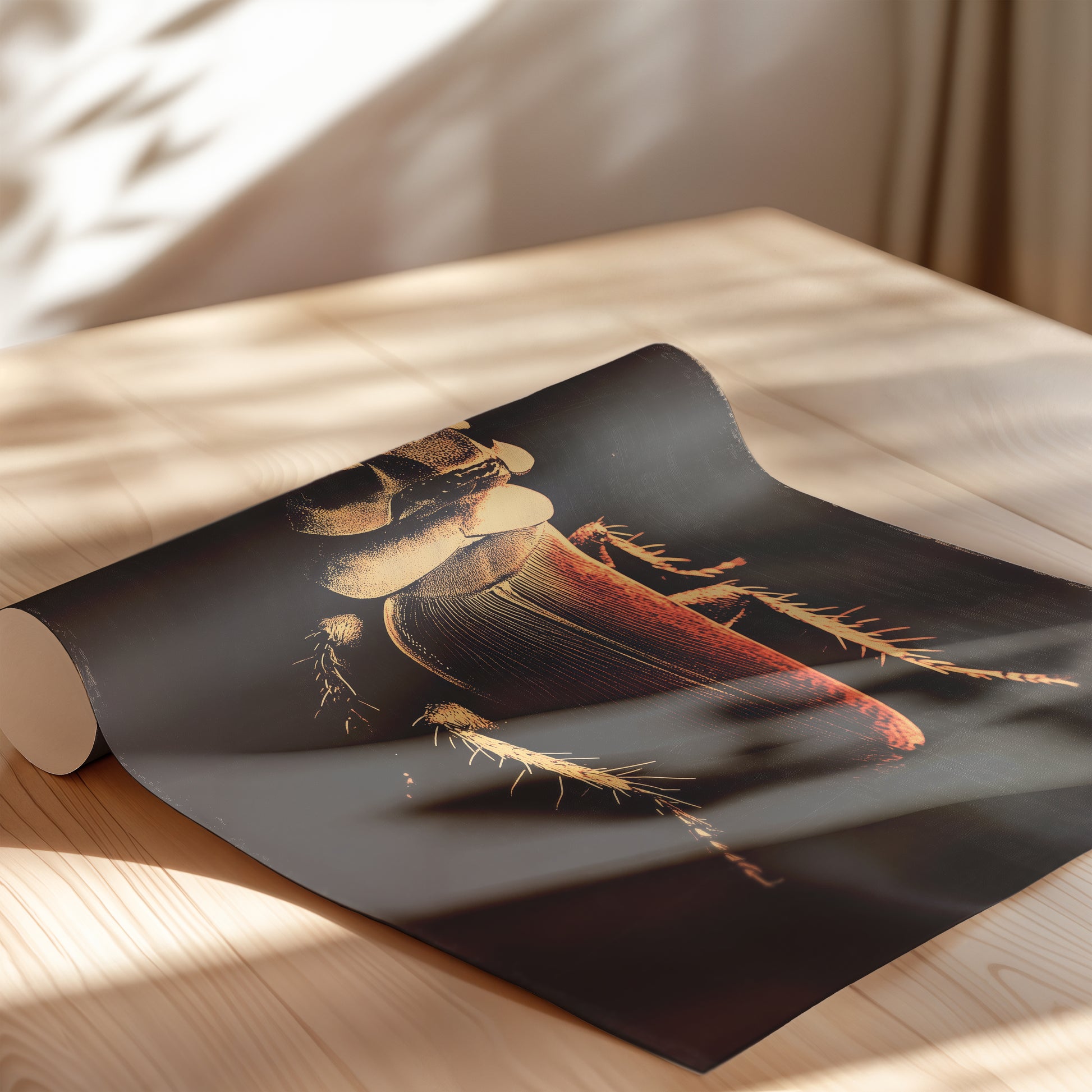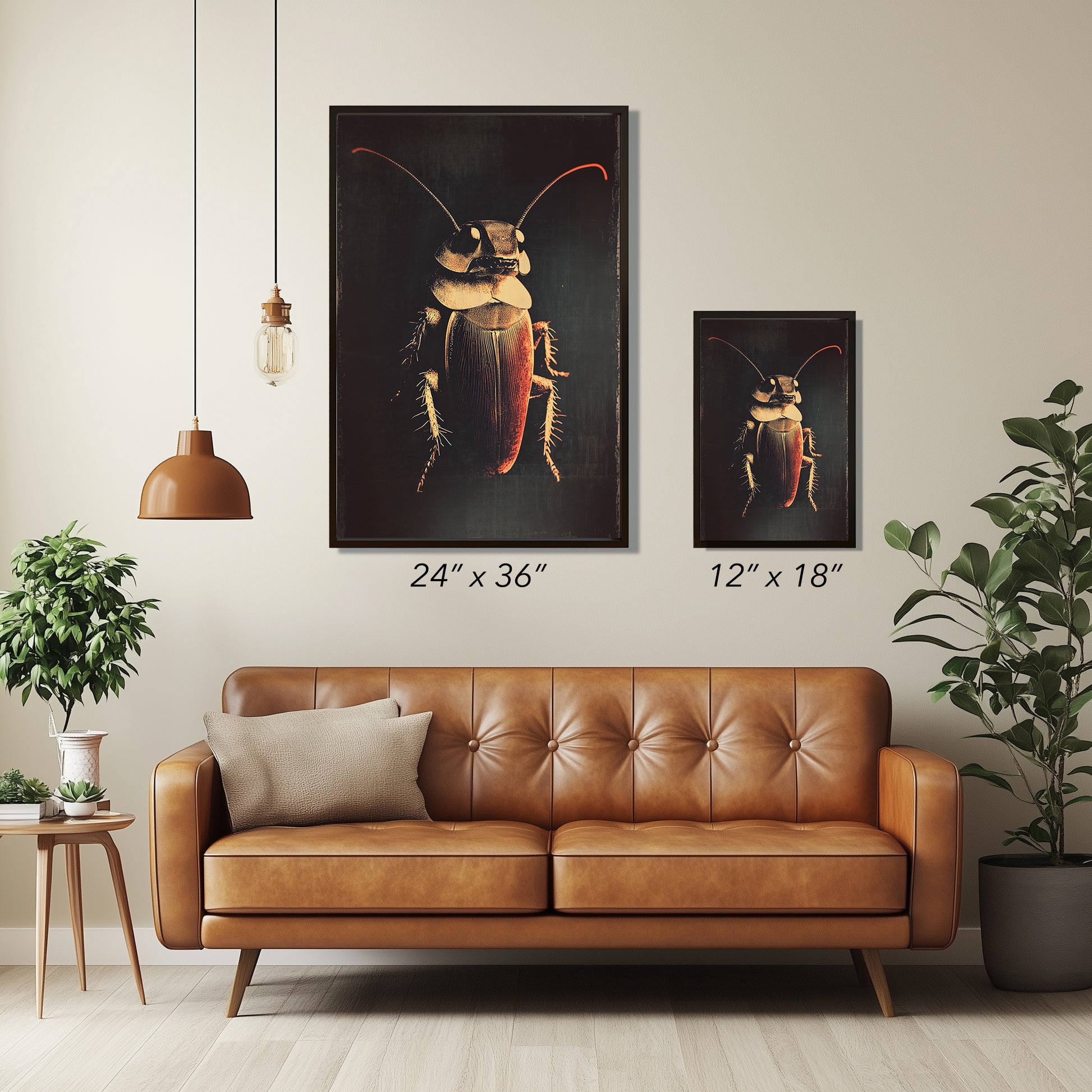 Cockroaches may scurry when the lights come on, but this one is here to stay—boldly captured against a velvety dark background. Inspired by the elegance of 1920s Italian posters, this print transforms the uninvited guest into a striking piece of art. With intricate detail and rich tones, it brings unexpected beauty to any room.