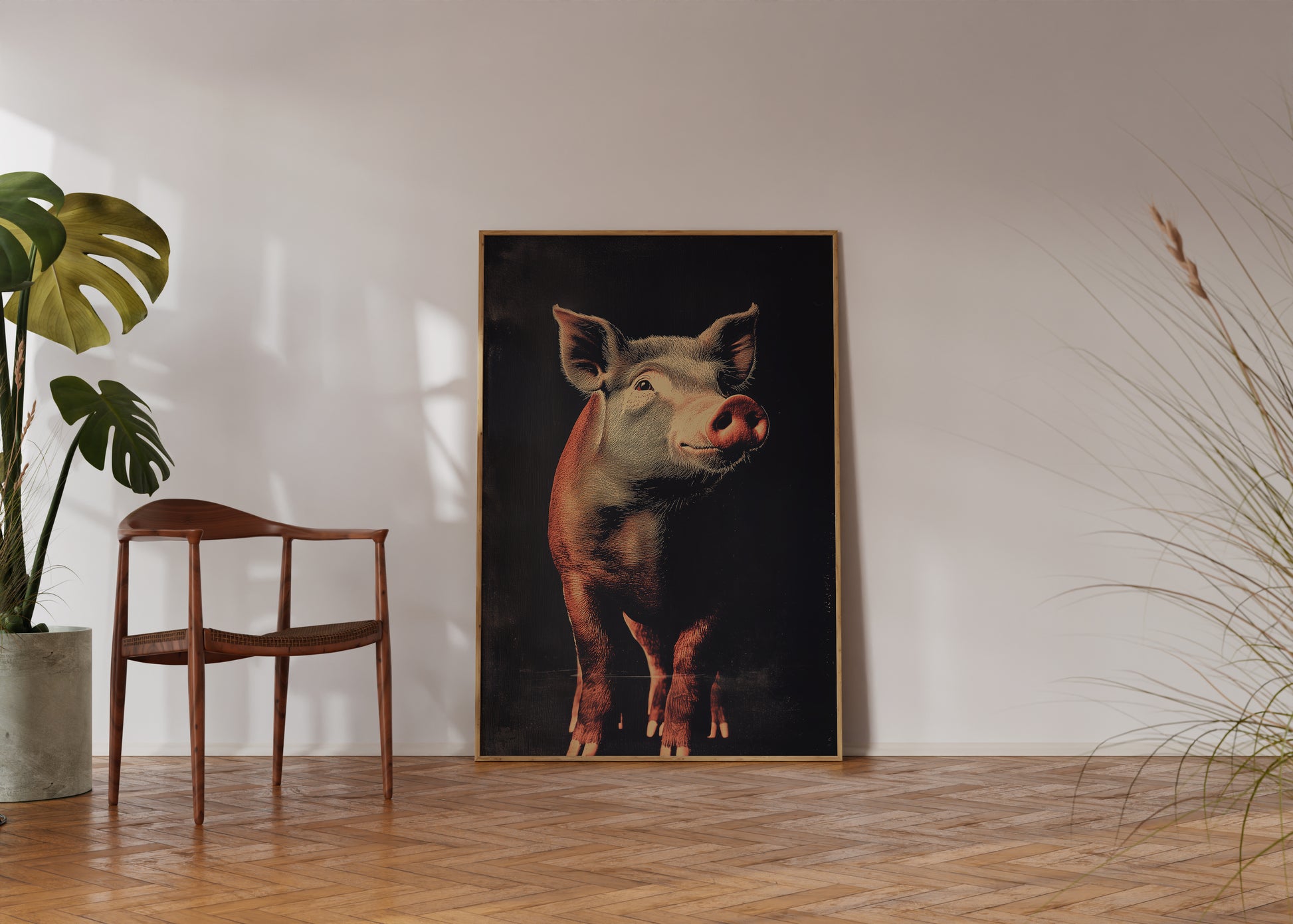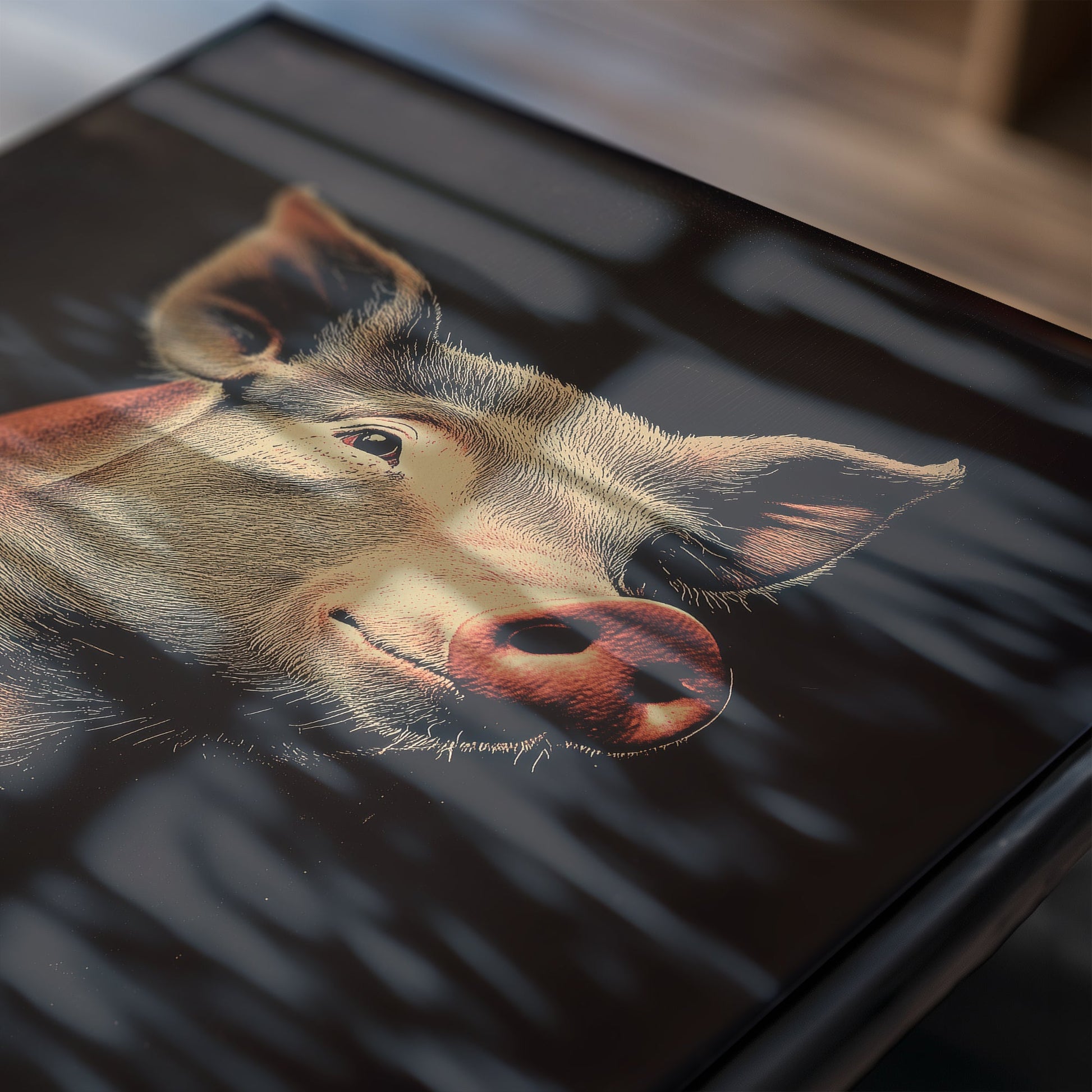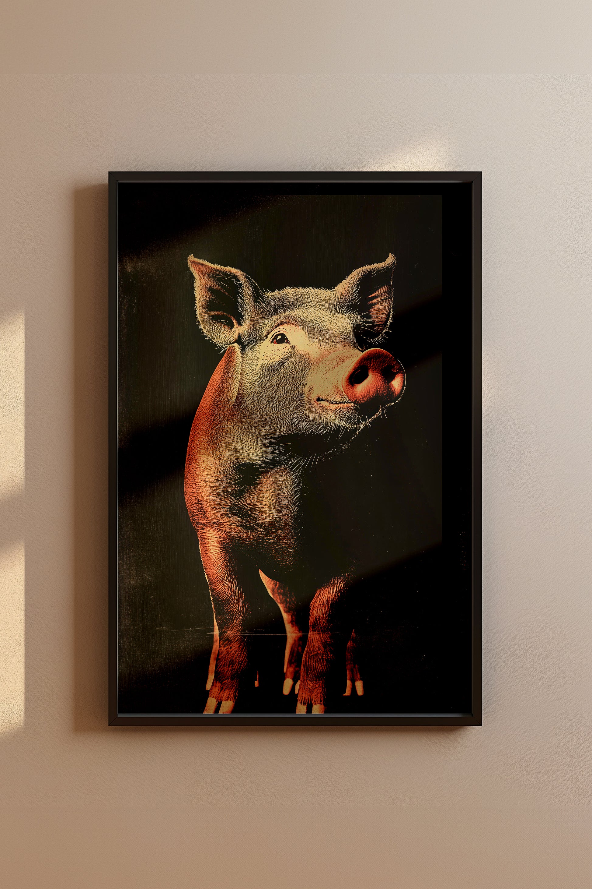 This print showcases the pig with a lively and endearing expression, its soft pink tones illuminated against a rich, textured background. The fine details of the pig’s snout, ears, and gentle eyes are highlighted with precision, offering a lifelike portrayal that captures both its personality and natural beauty. The playful upward tilt of the head adds an element of whimsy, balanced by the refined lighting and shadowing throughout the composition. Produced on premium matte paper, the print captures every nuance of the pig’s features with clarity and depth. The warm, natural tones are preserved for long-lasting vibrancy, ensuring the image retains its visual impact over time. Blending the charm of the subject with a vintage-inspired design, this piece serves as a delightful yet sophisticated addition to spaces that value distinctive imagery. The pig’s depiction resonates with both playfulness and elegance.