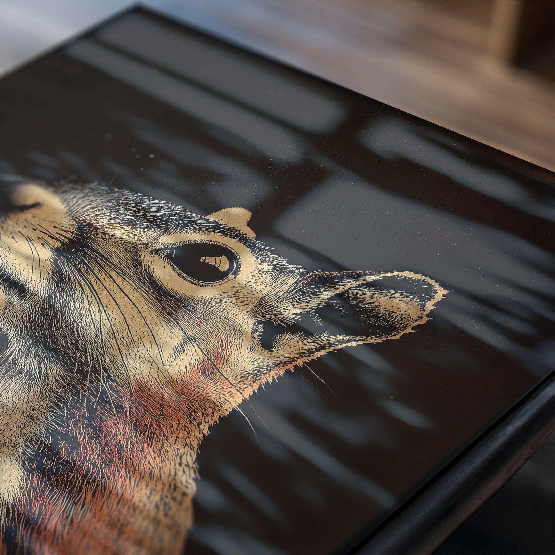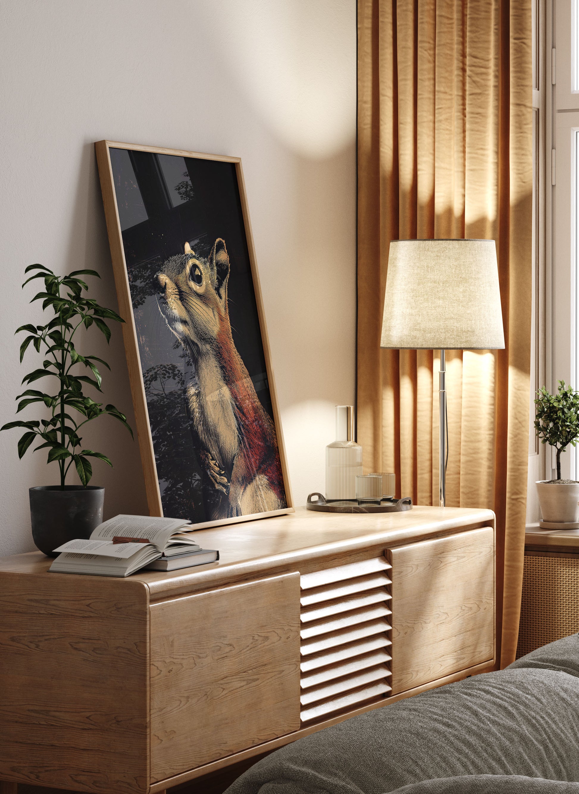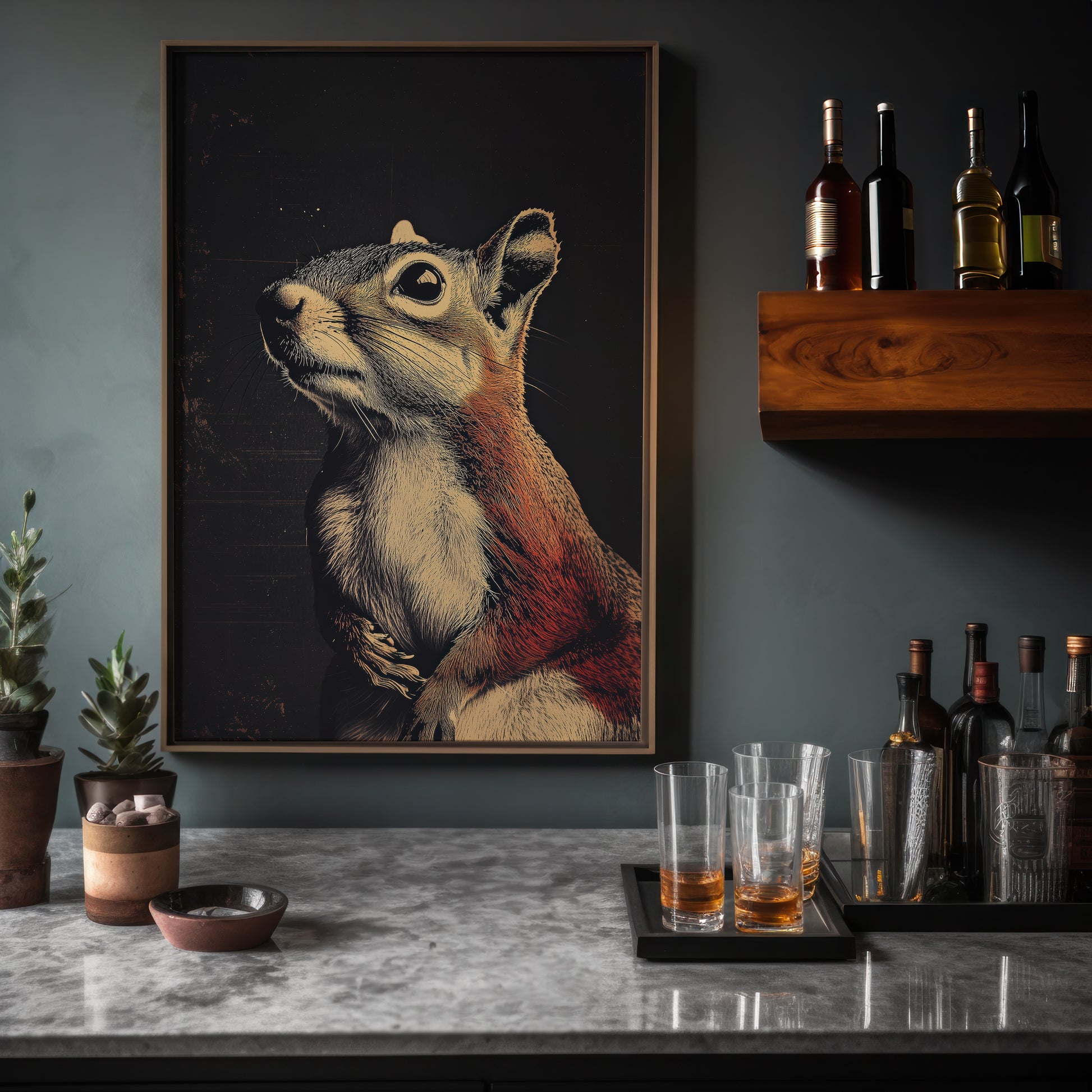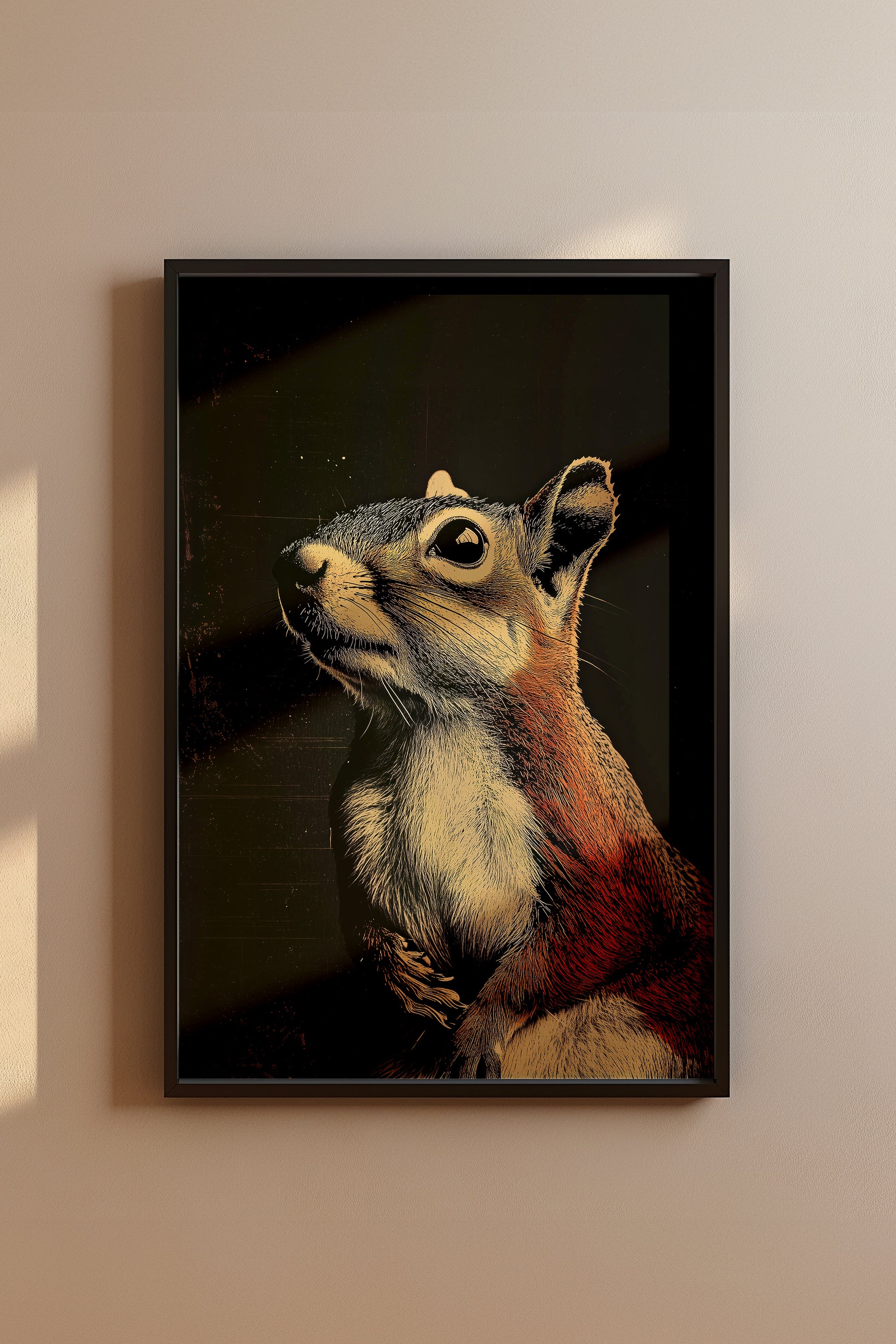 This captivating print showcases the curious and spirited nature of a squirrel in stunning detail. Set against a rich, dark backdrop, the delicate textures of the squirrel's fur and its poised stance are brought to life through an intricate interplay of light and shadow. The composition emphasizes the natural charm and agility of the subject, giving the print a dynamic yet timeless feel. Produced on premium matte paper, the piece ensures remarkable clarity and durability, with colors and details that remain vibrant over time. The sharp contrasts highlight the squirrel’s inquisitive gaze and fine whiskers, drawing attention to its nuanced expression and lively presence. This print celebrates the quiet elegance of wildlife with a vintage-inspired aesthetic, making it a striking focal point for any room.